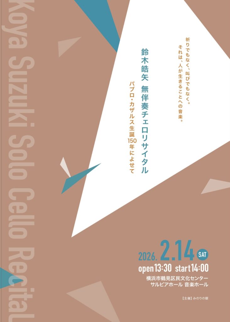 2月14日、横浜市鶴見区民文化センター・サルビアホール(音楽ホール)にて開催された《鈴木皓矢 無伴奏チェロリサイタル【パブロ・カザルス生誕150年によせて】》は、おかげさまで多くの方にご来場いただき、無事終演いたしました。