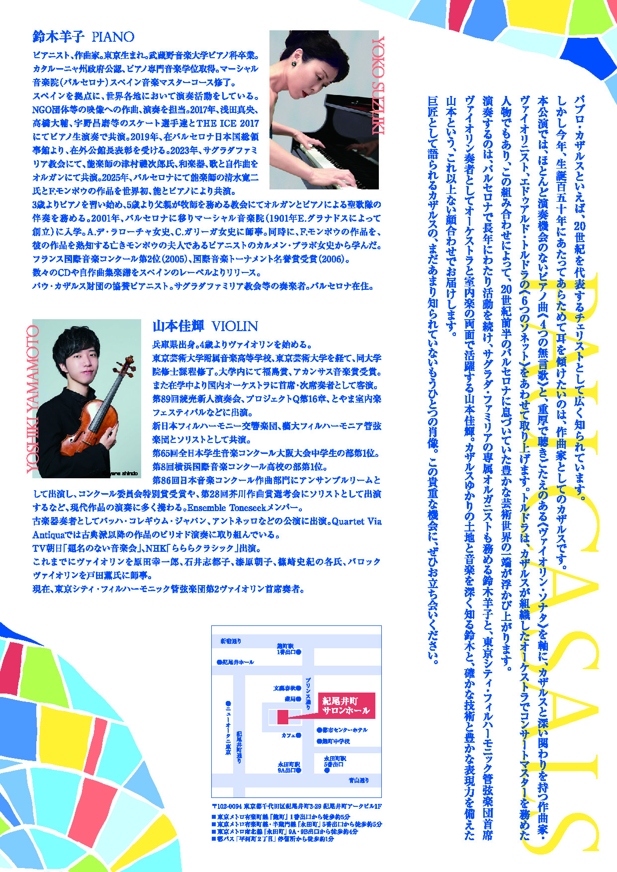 演奏するのは、カザルスゆかりの地バルセロナで長年活躍し、サグラダ・ファミリアの専属オルガニストも務めるピアニスト、鈴木羊子。そして、東京シティ・フィルハーモニック管弦楽団首席ヴァイオリン奏者としてオーケストラ、室内楽の両面で高い信頼を集めるヴァイオリニスト、山本佳輝。